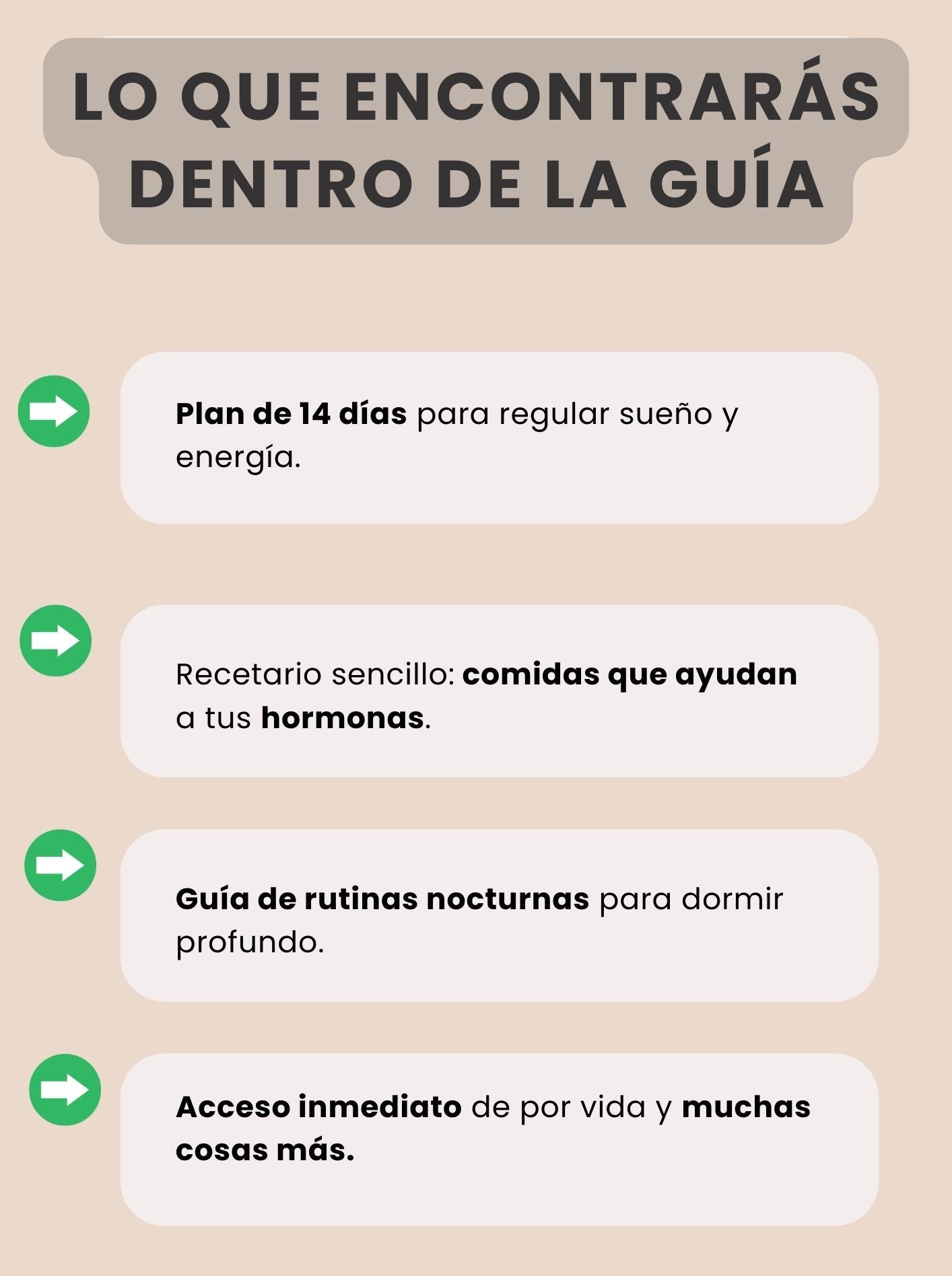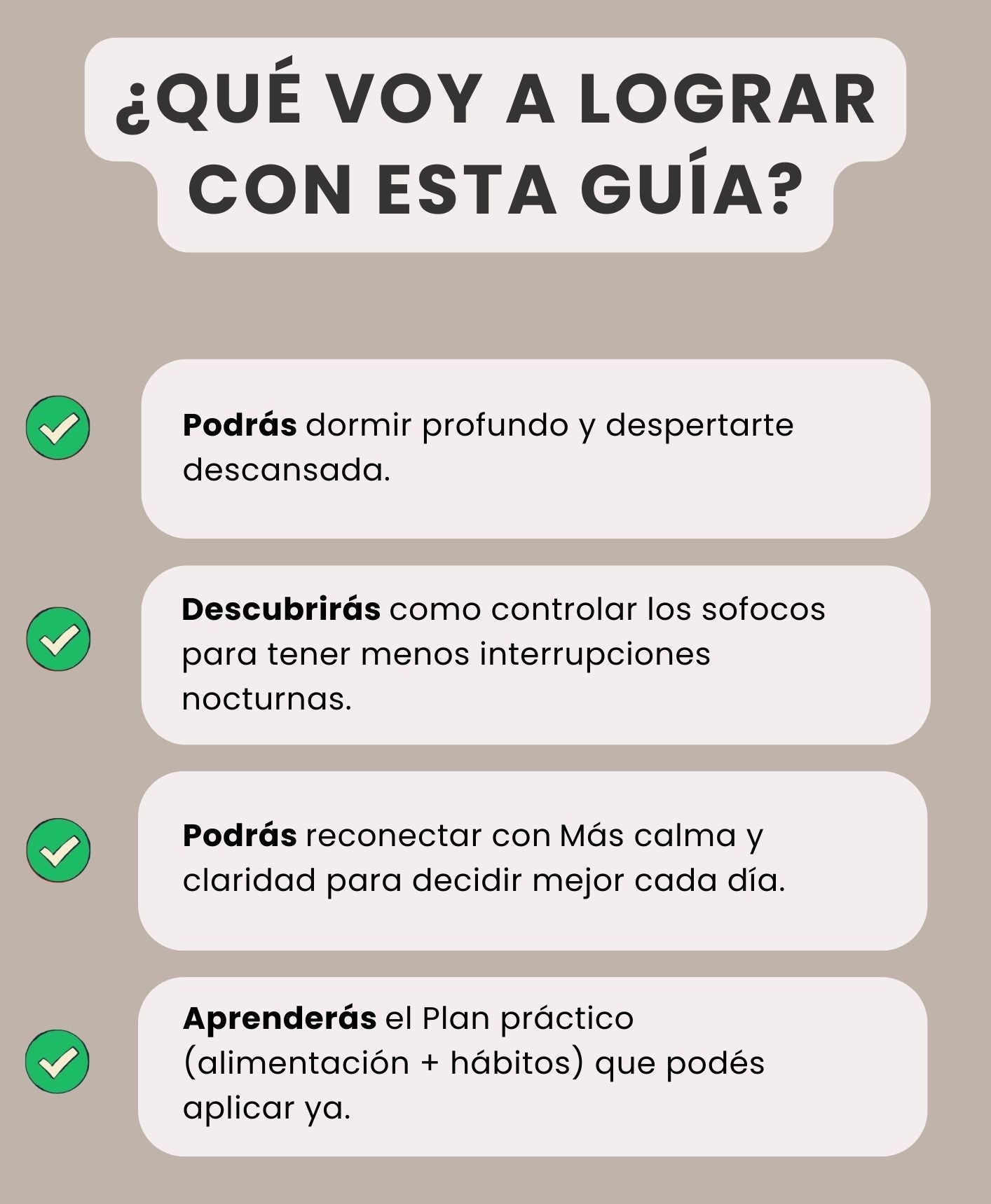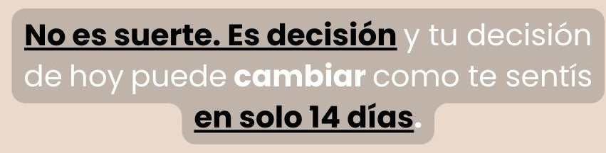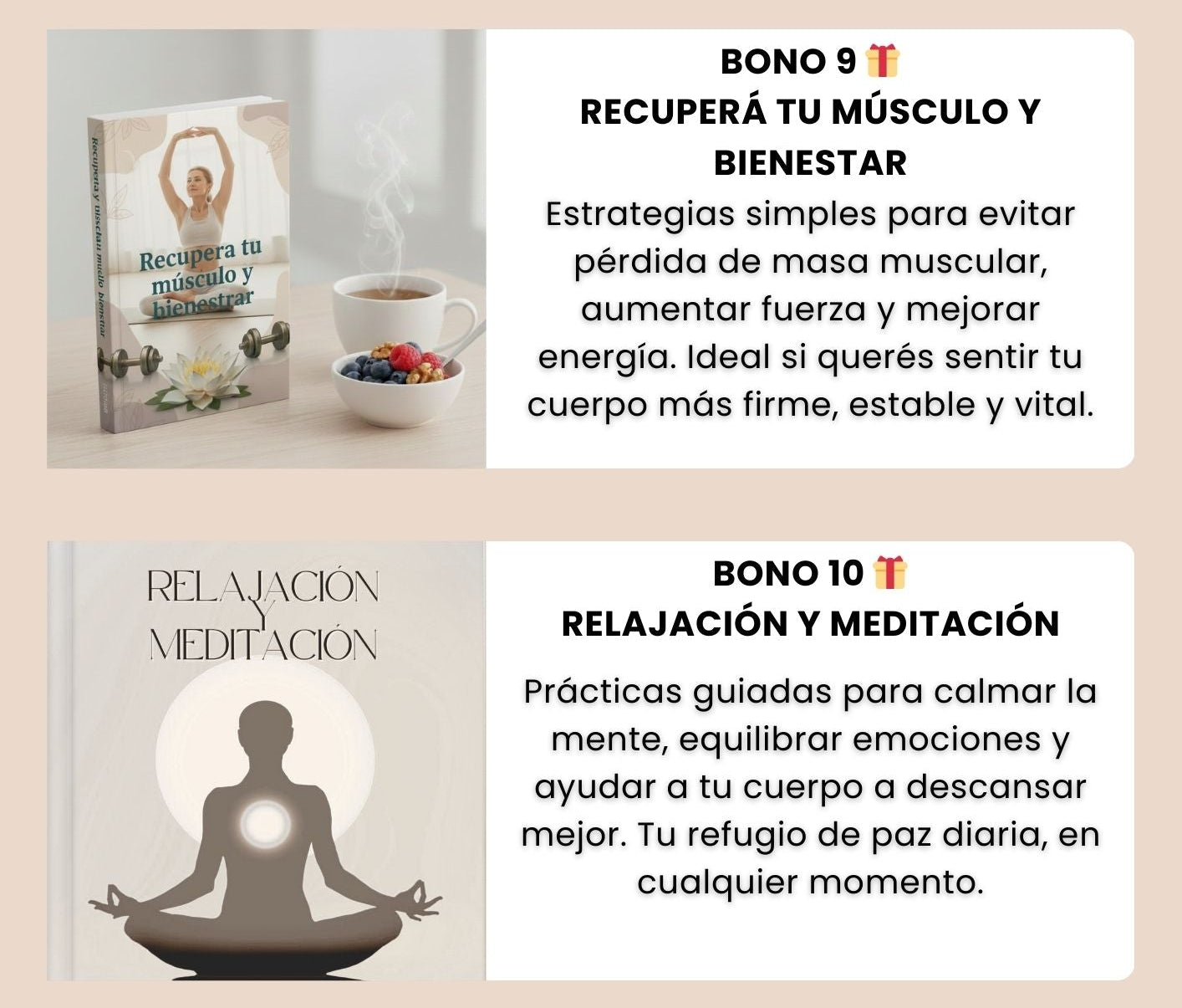 Muchas mujeres que aplican lo que enseño comienzan a notar mejoras en energía, sueño o bienestar emocional en las primeras 2 semanas. No es garantía médica, pero sí el resultado de aplicar las estrategias paso a paso.