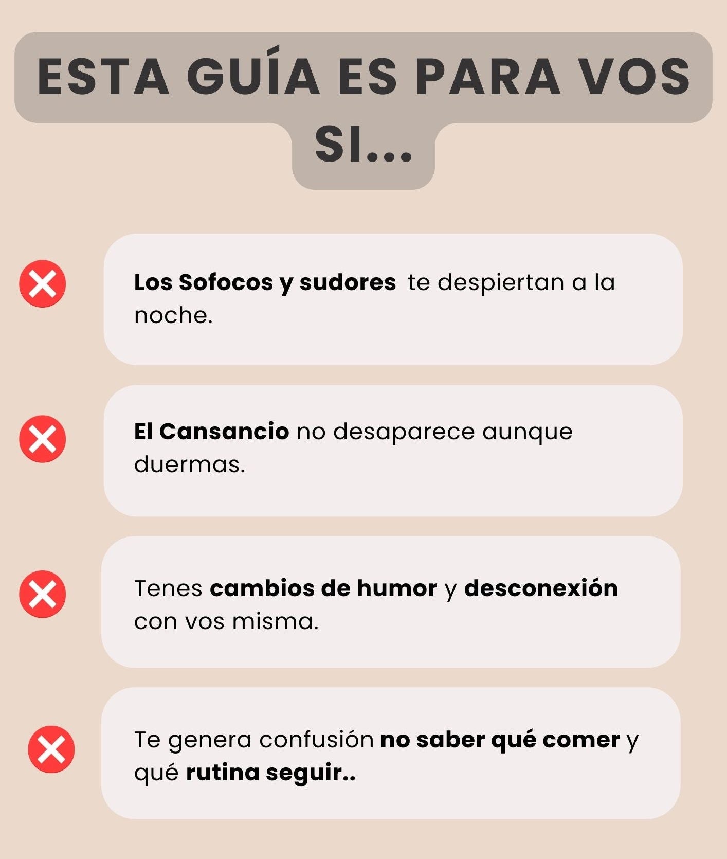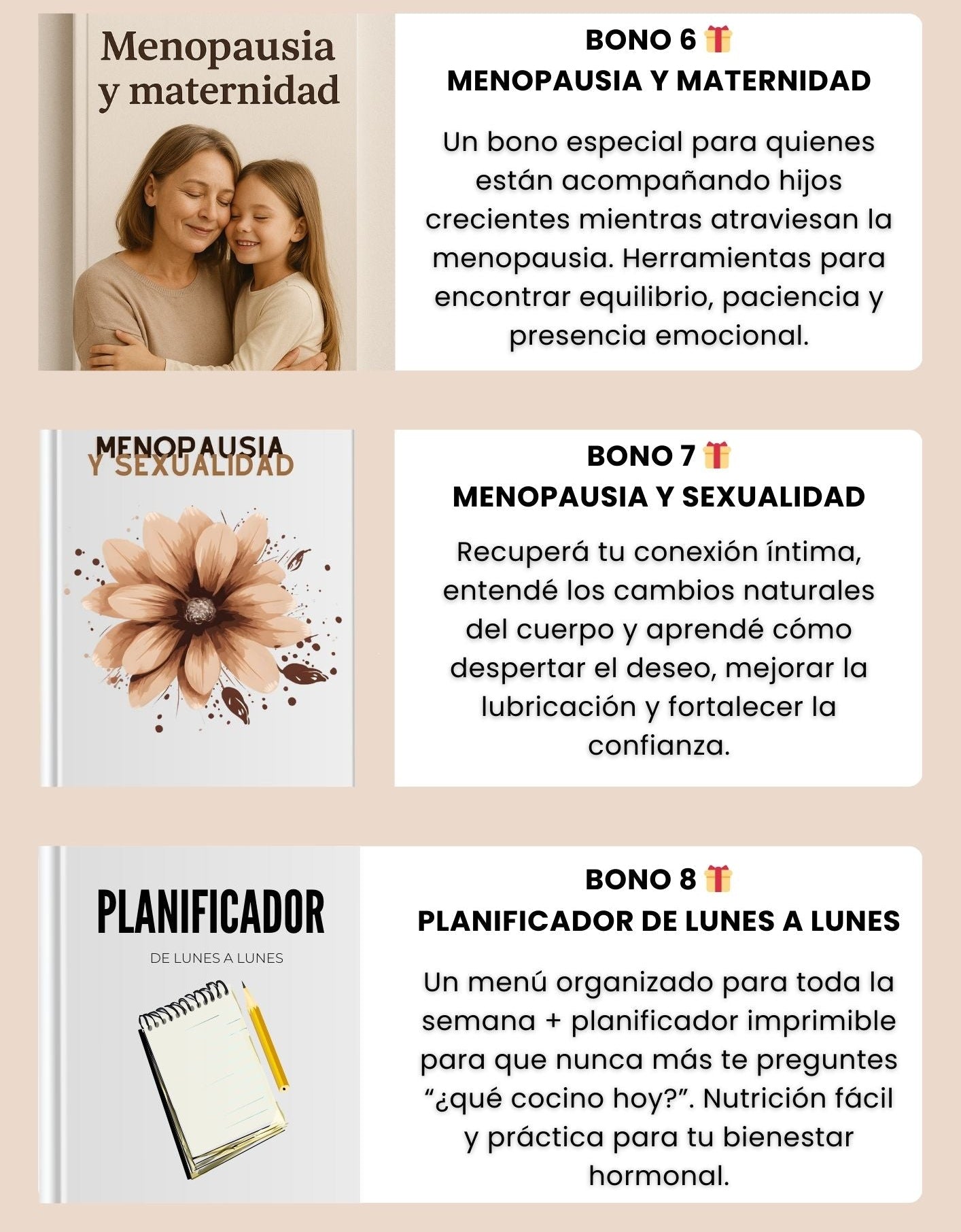Incluye guías prácticas, explicaciones claras sobre tus síntomas, estrategias para cuidarte emocionalmente, rutinas de autocuidado y hábitos concretos para vivir la menopausia con más serenidad.